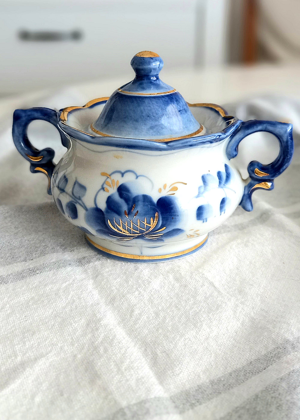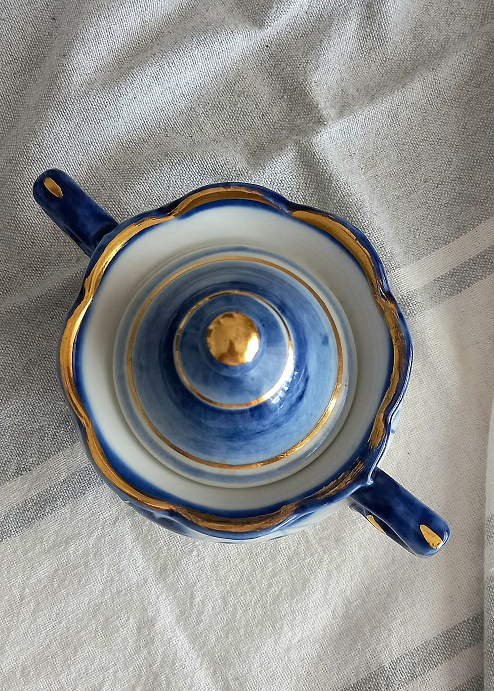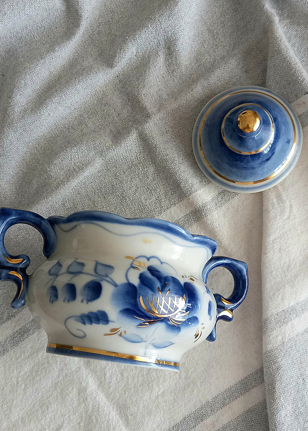 Vintage sugar bowl Gzhel, 1990s, Russia.